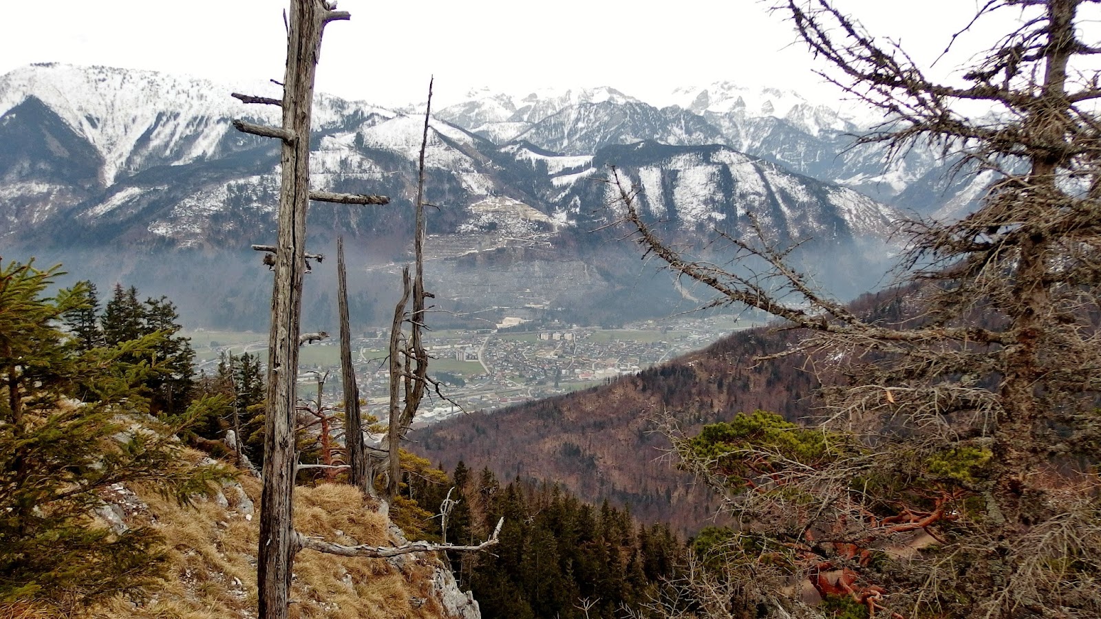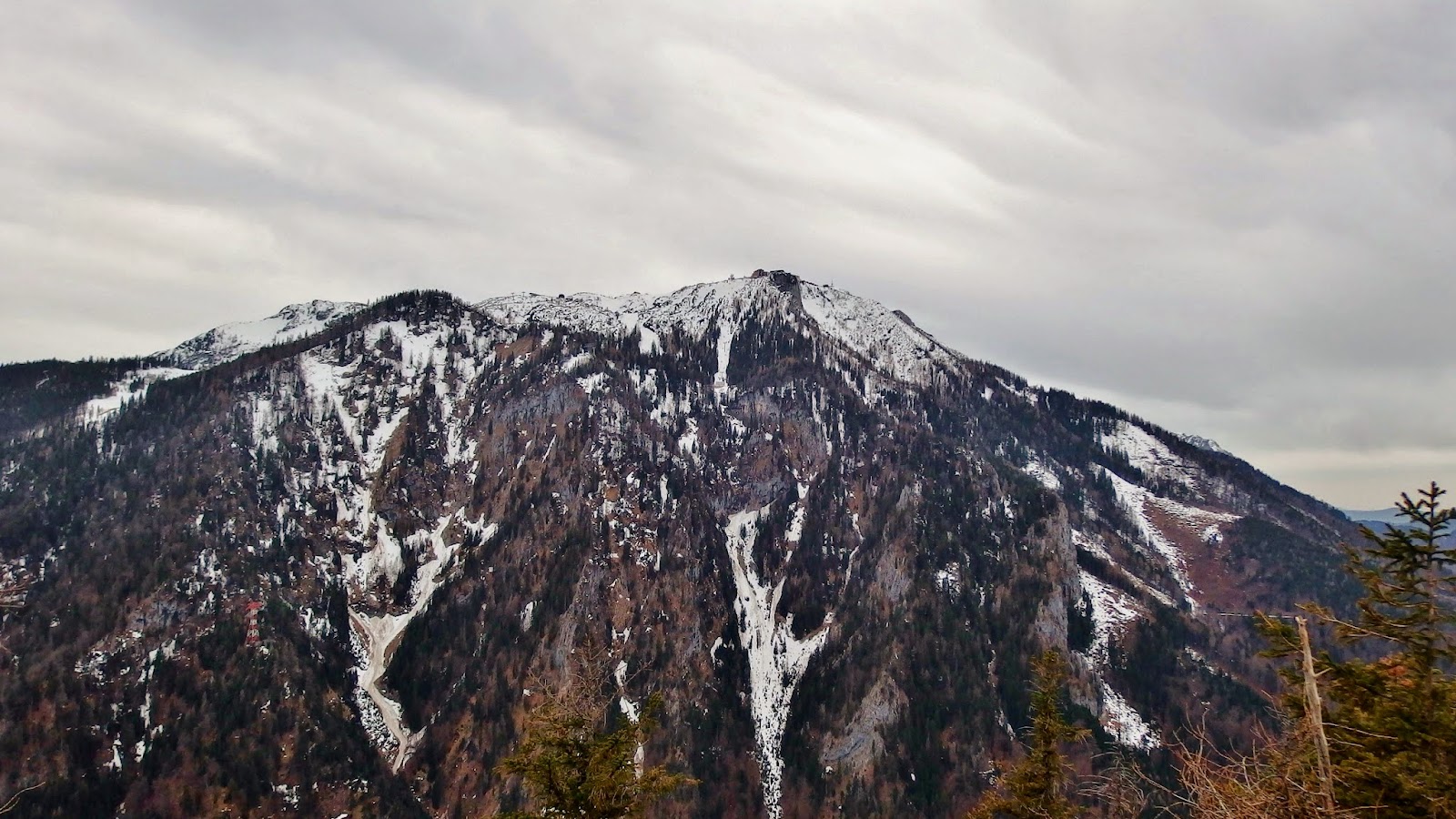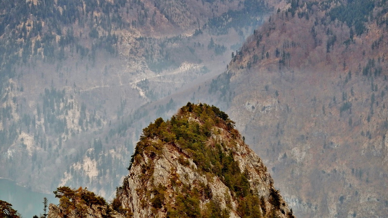 Anschließend stieg ich wieder ca. 100 Höhenmeter zur Sonnsteinscharte hinunter und zweigte in Richtung Großer Sonnstein ab. Ich kämpfte mich durch Schlamm und  nervige Schneefelder bis ich die letzten Seilversicherungen kurz vorm Gipfel des Großen Sonnsteins erreichte.  Nach einigen Bildern vom Gipfelkreuz und einem Handyfoto für ein Bergpaar, lief ich im Laufschritt den Großen Sonnstein in Richtung Ebensee hinunter. Nach einigen negativen Höhenmetern, bog ich danach allerdings in Richtung Sonnsteinforststraße ab. Die Sonnsteinforststraße ist eine weit verzweigte Straße die vor allem bei Mountainbikern sehr beliebt ist. Aber auch der ein oder andere Skitourengeher nutzt in so manchem Winter dieses Forststraße für eine Skitour auf den Großen Sonnstein,