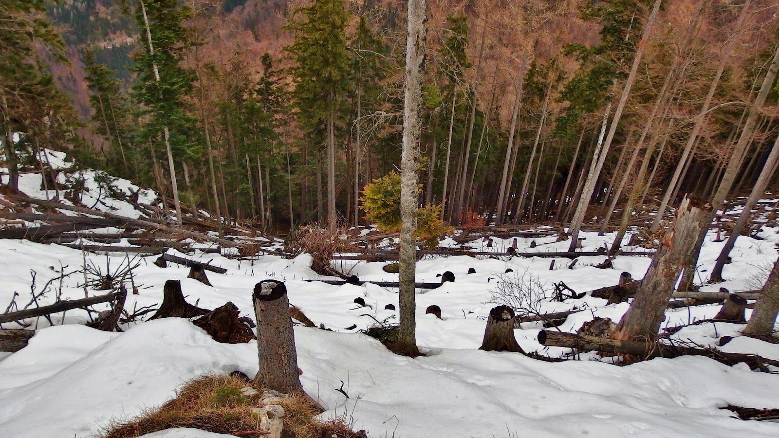Nach 15 Minuten erreichte ich eine Art Grat. Der teils auch sehr felsige Grat wollte gar nicht mehr enden und plötzlich sah ich auch sehr blasse gelbe Markierungen ,denen ich weiter folgte. Nach  45 Minuten „Gratkletterei“, erreichte ich einen Abgrund , den man nicht mehr weiter abklettern konnte. Ich stand mittlerweile schon direkt gegenüber des sehr markanten Feuerkogels. Weil ich diesen langen Grat nicht wieder zurückgehen wollte, beschloss ich anschließend nach Norden querfeldein abzusteigen. Der Abstieg war alles andere als lustig und ich fluchte über Bruchharsch, Dornenfelder, Felsabbrüche und Sumpfflächen.