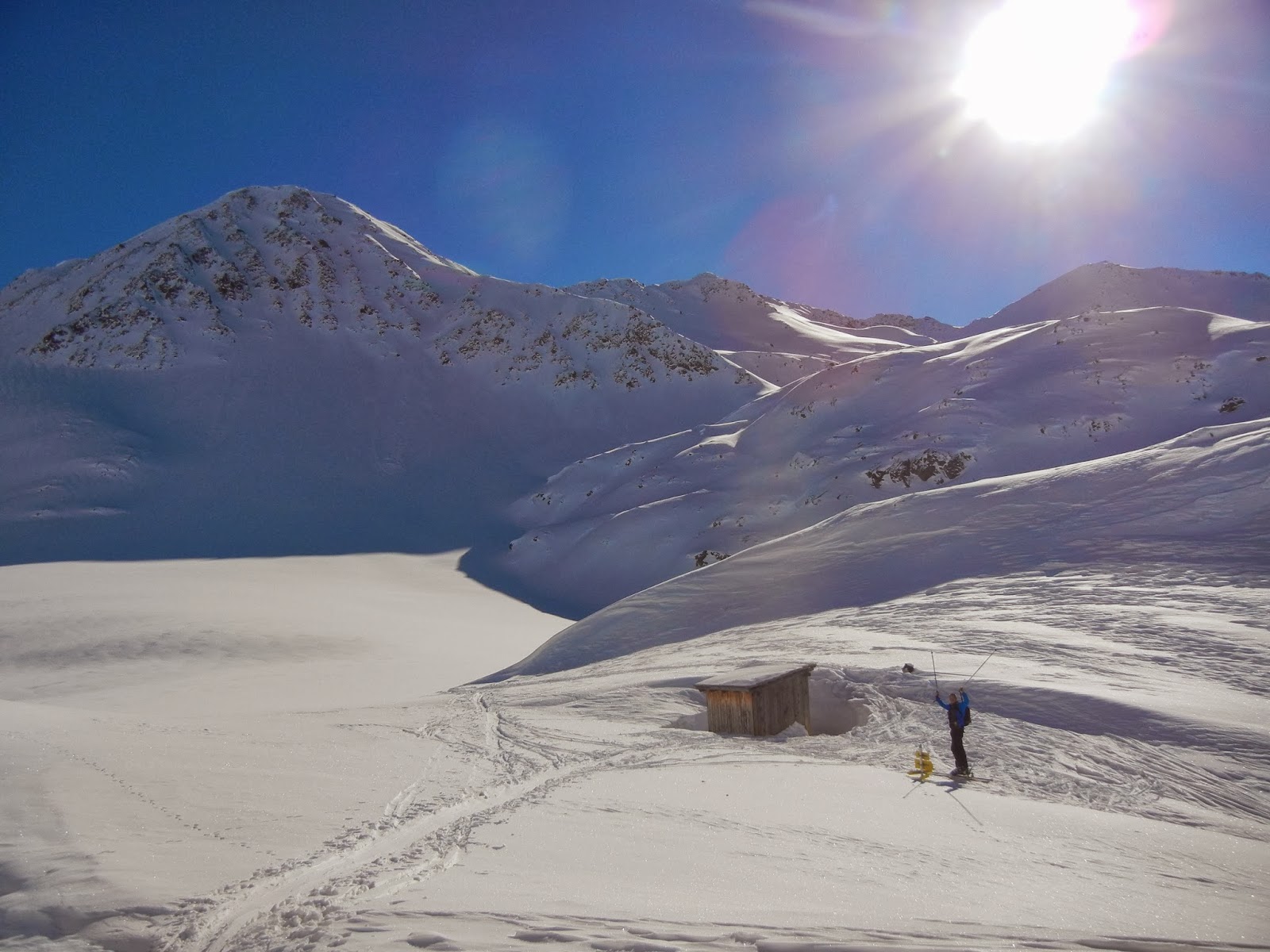 Die Abfahrt, bei herrlichem Pulverschnee im oberen Bereich und etwas aufgeweichtem, aber gut fahrbarem Untergrund im unteren Bereich, ist ein einziger Genuss und wir lassen uns viel Zeit um die letzten Meter an diesem Tag vollends zu genießen.