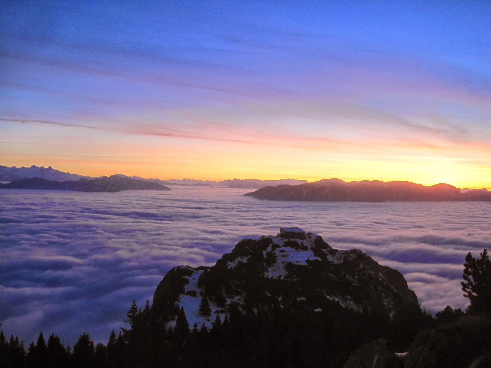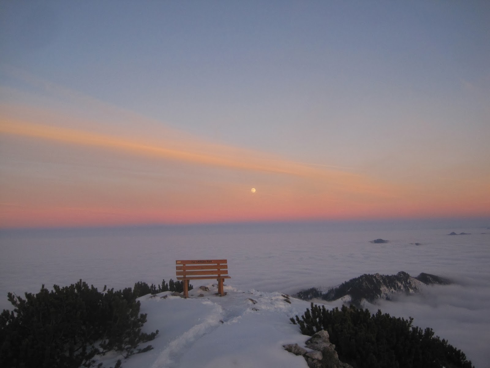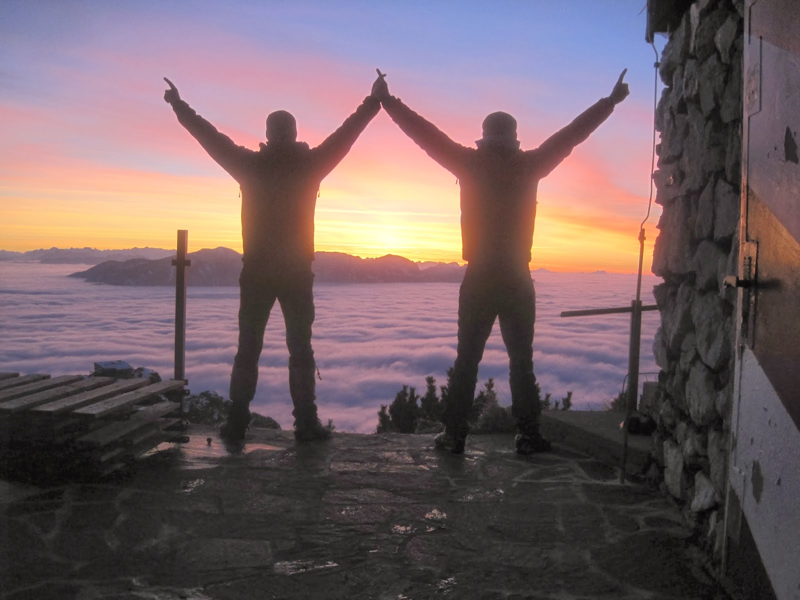 Ab 16.30 Uhr verändern sich die Stimmungen im Minutentakt, über der Nebelsuppe kommt man sich vor wie in einem Fantasieland. Die Schadenfreude beim Blick ins oberösterreichische Flachland ist groß, unsere Heimatstadt Linz kann sich mit Steven Spielbergs Blockbuster „Nebel des Grauens“ messen. Es sind Momente, die das Leben eines Bergsteigers ausmachen. Die Röte der Abendsonne lässt die umliegenden Berggipfel in den schönsten Farben strahlen und wir sind froh unsere berauschten Hintern doch noch aus dem Bett bekommen zu haben.