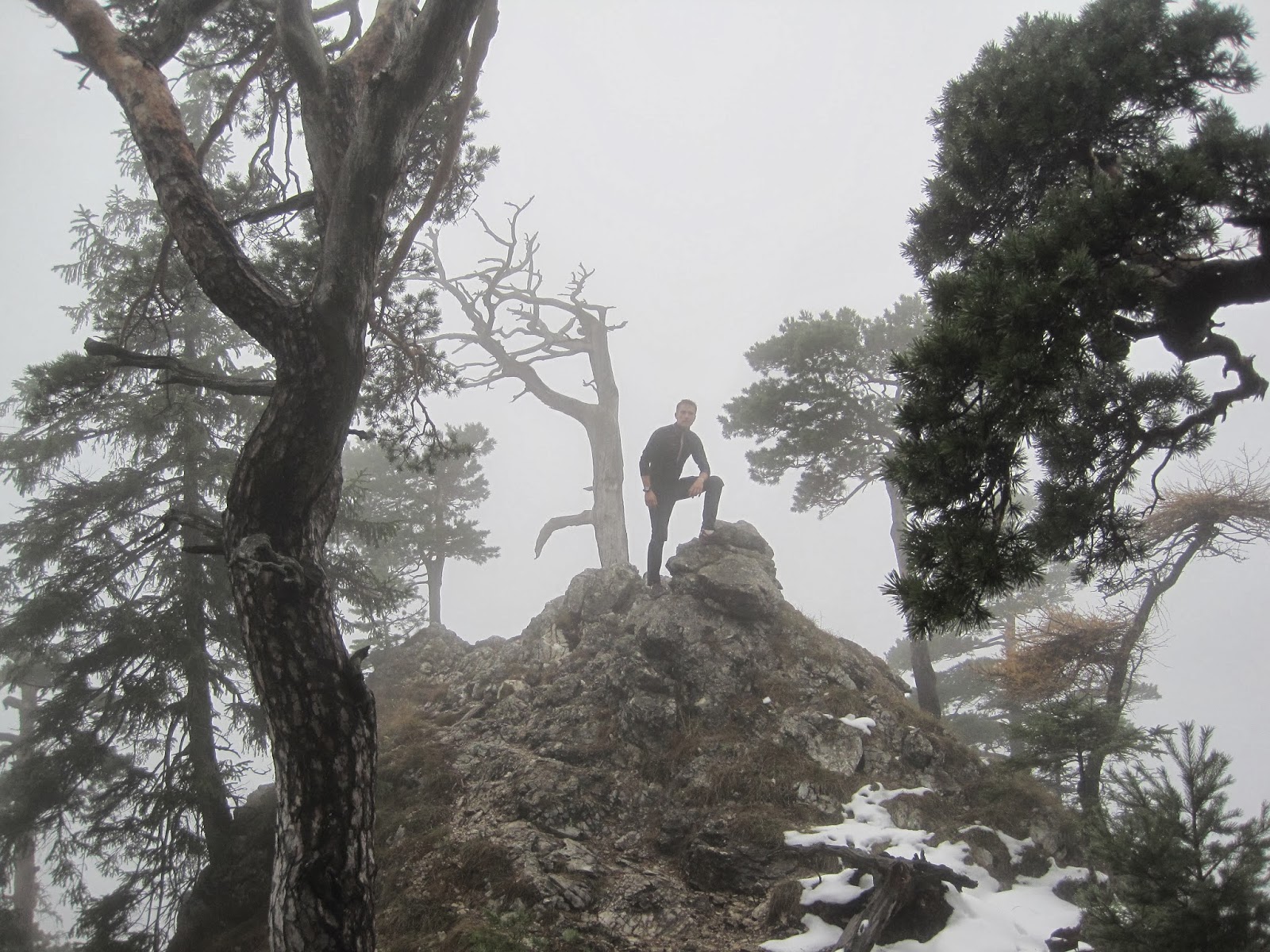 Aufgrund eines geplanten flüssigen Abends am Vortag, aber einem formidablen Inversionswetter auf den Bergen, vereinbarten wir für den heutigen Samstag eine Sonnenuntergangs-Tour. Nach einigen Überlegungen wurde der Traunstein als perfekte Destination für eine Verabschiedung des Hitzeplaneten über der Nebelschicht auserkoren. Der Felskoloss am Fuße des Traunsees ist uns beiden bestens bekannt und ein Abstieg sollte auch im Dunkeln zu meistern sein. Wir starten unsere Tour um 12.30 Uhr vom Parkplatz am Ostufer des Traunsees und wärmen unsere müden Beine beim Spaziergang zum Naturfreundesteig-Einstieg bestens auf. Die Idee über den alten Naturfreundesteig aufzusteigen , verwerfen wir aufgrund der unsicheren Schneelage wieder und klettern über die ersten versicherten Stellen empor. Das Wetter unter dem Nebel, dem wir bald zu entlfliehen hoffen, sehr trüb und miesepetrig. Arme Gmundner!