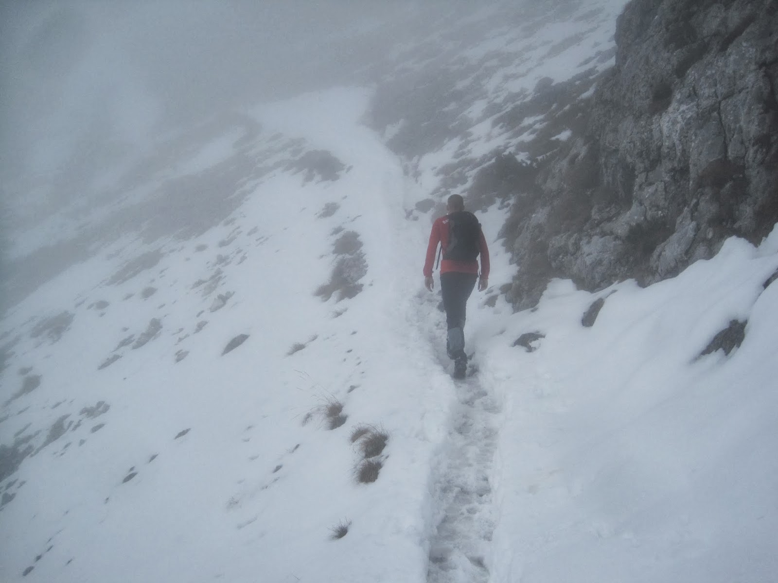 Die Wenigen, die heute den Weg auf den Traunstein gefunden haben, befinden sich bereits wieder im Abstieg und berichten uns von einer durchgehenden Nebeldecke bis zum Bösen Eck (etwa 1400m). Erfreut über die positive Info eilen wir schleunigst dem Felsentor entgegen um sobald wie möglich die kostbaren Sonnenstrahlen einzuheimsen. Die Schneelage am „Stoa“ heute, im Vergleich zu meiner Besteigung am vergangenen Dienstag, absolut kein Problem- auch die Querungen völlig ungefährlich.